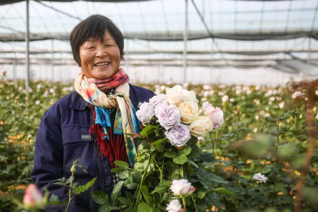 在玫瑰大棚,村民代洪侠手法娴熟地对刚刚采收的玫瑰进行分拣、包装。“就在俺家门口,和邻居们一起赚个零花钱,特别好。”她笑着说道。像代洪侠这样实现家门口就业的村民在基地里有十多位,他们经过培训,参与到种植、管护、电商发货等各个环节,在家门口就有一份工作。
