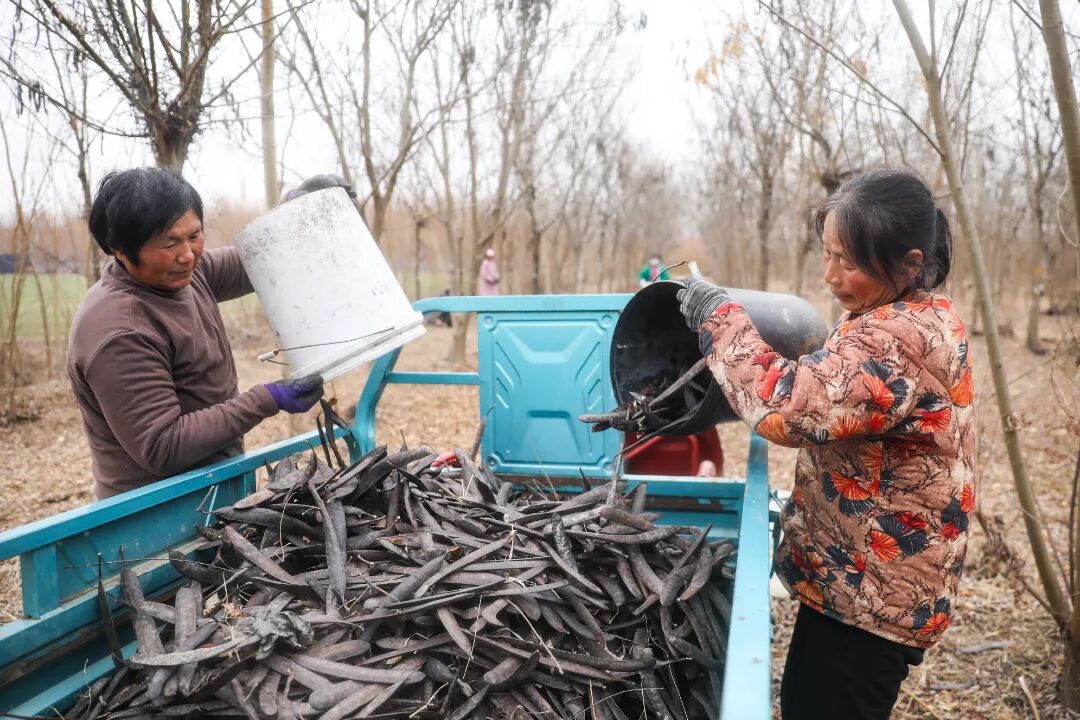 走进皂角种植基地,村民们正手持长竿,熟练地敲打着枝头,一颗颗饱满的皂荚随之“噼啪”落下,铺满林下地面。欢声笑语与收获的忙碌交织在一起,构成一幅动人的丰收图景。